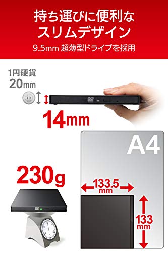 9.5mm超薄型ドライブを採用し厚さ14mm、質量わずか230g、ウルトラスリムPC、WindowsタブレットPCなどと一緒にご使用する環境にピッタリの製品
