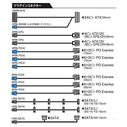 【組み立てやすく・拡張性のケーブル仕様! 】CPU(ATX/EPS12V) ケーブルが歴代最長の85cm、ケーブル形状がフラットで裏配線でも組み立てやすい! (ATX24pinケーブルを除く) PCI Expressも6+2pin×6に対応し、最新のハイエンド構成に対応!