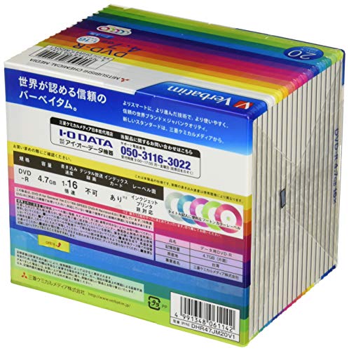 バーベイタムジャパン(Verbatim Japan) 1回記録用 DVD-R 4.7GB 20枚 5色カラーディスク 片面1層 1-16倍速 DHR47JM20V1