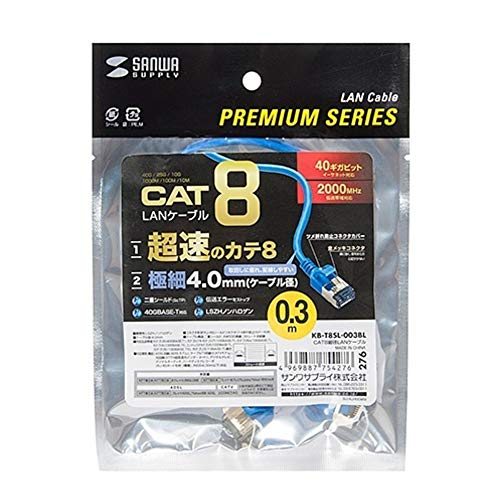 サンワサプライ CAT8 細径LANケーブル(0.3m) 40Gbps/2000MHz RJ45 ツメ折れ防止 ブルー KB-T8SL-003BL