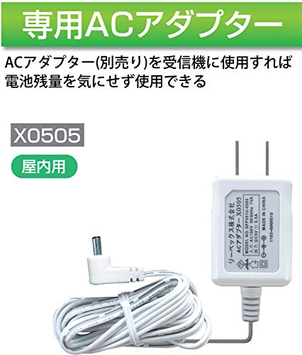 電源:送信機/ボタン電池CR2032×1個(テスト用電池付属)、受信機/AC100V 50/60Hz(消費電力2W)