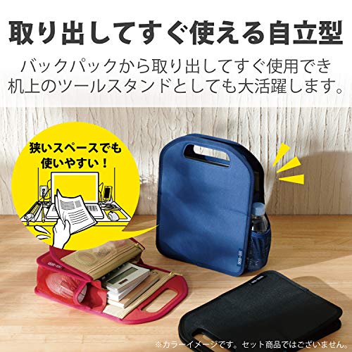 文房具やPC周辺機器を用途別に整理して収納できる、多彩なポケットを装備しています。