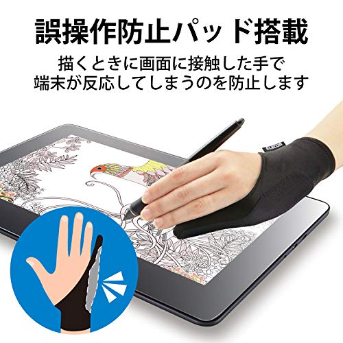 グローブの画面接触部分に非通電パッドがついているので、絵を描くときに画面に接触した手による誤操作を防止します。