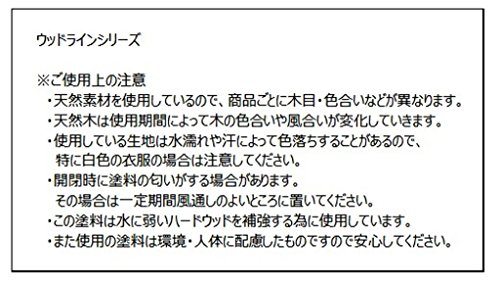 使用上の注意:天然素材を使用しているので、商品ごとに木目・色合いなどが異なります。天然木は使用期間によって木の色合いや風合いが変化していきます。使用している生地は水濡れや汗によって色落ちすることがあるので、特に白色の衣服の場合は注意してください。開閉時に塗料の匂いがする場合があります。その場合は一定期間風通しのよいところに置いてください。この塗料は水に弱いハードウッドを補強する為に使用しています