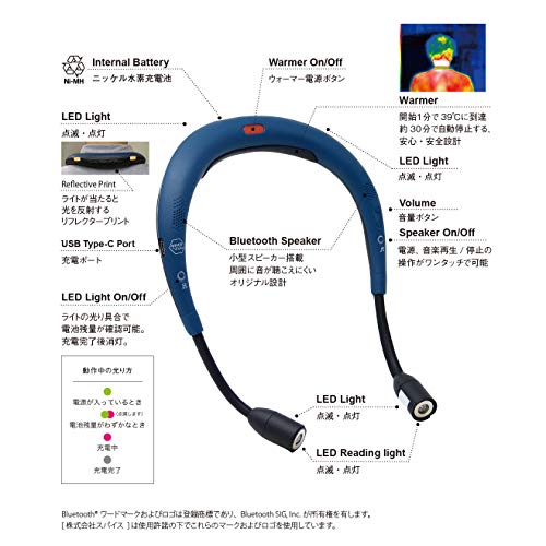 USB充電式(ニッケル水素蓄電池) 単一機能の連続使用時間: スピーカー約12時間、LEDライト約21時間、ウォーマー30分×16回(スピーカー、ライト、ウォーマー同時使用約3時間)