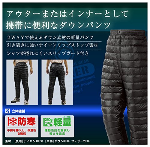 表地素材:ナイロン100%中綿素材:ダウン80%、フェザー20%適応サイズ(単位/cm):M(身長160~170、ウエスト72~80、総丈107、股下74)、L(身長170~180、ウエスト78~88、総丈109、股下75)、LL(身長175~185、ウエスト86~96、総丈111、股下76)、3L(身長175~185、ウエスト94~104、総丈113、股下77)