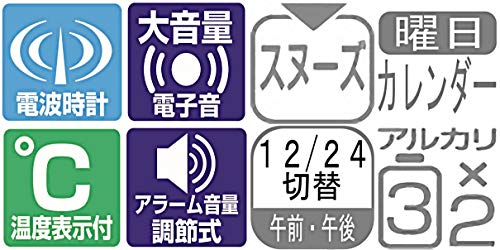 機能:電波時計/電子音アラーム/音量(大・小)切替式/12(午前・午後)・24時間表示切替式/カレンダー表示/温度表示/ライト付/スヌーズ/アラームオートストップ/アラームモニター