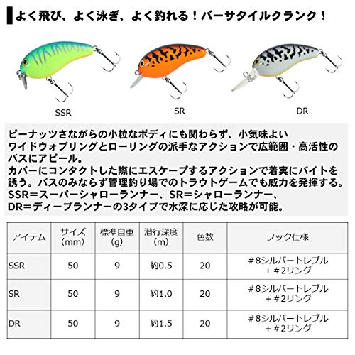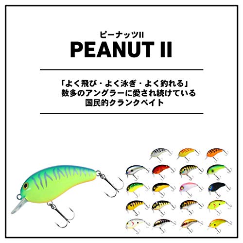 発売以来、天文学的な数のピーナッツが数多のアングラーに使われ続けてきたが、その理由はただ一つ、釣れるから。これ以外ない。数えきれないほどのクランクベイトが存在する中、今なお埋もれない本物の食わせのサイズとアクションの黄金比は初心者からトップトーナメンターまで幅広い層に愛され続けている。とにかくよく飛び・よく泳ぎ・よく釣れる。釣り人の意思を忠実に実行するその素直さは、クランクベイトの不変不朽のスタンダードと呼ぶにふさわしい。まさにピーナッツさながらの小粒なボディにも関わらず、