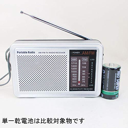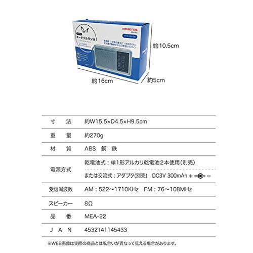 重量:約270g. 材質:ABS 銅 鉄. 電源方式:乾電池式 : 単1形アルカリ乾電池2本使用( 別売 または交流式 : アダプタ(別売) DC3V 300mAh. 受信周波数:AM : 522~ 1710KHz FM : 76~108MHz. スピーカー:8[オーム].