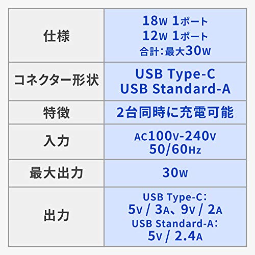 [コネクタ形状]USB Type-C/USB Standard-A、[仕様]18W 1ポート/12W 1ポート 合計:最大30W