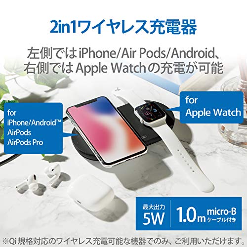 スマートフォンやAirpods等を置くだけで5Wで充電ができ、AppleWatch磁気充電ケーブルをはめ込むことでAppleWatchを同時に充電できる、Qi規格対応ワイヤレス充電器です。