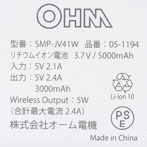 オーム電機 モバイルチャージャー ワイヤレス対応 5000mAhタイプ ホワイト SMP-JV41W 05-1194 OHM 幅71×高さ140×奥行き