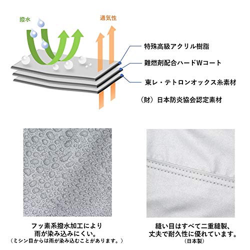 【素材】東レ・テトロンオックス糸素材に特殊高級アクリル樹脂、難燃剤配合ハードWコート、フッ素系撥水加工、ポリエステル100%、(財)日本防炎協会認定素材