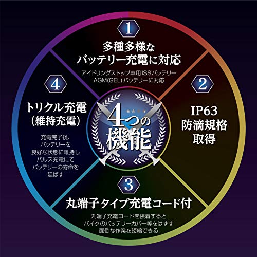 保護機能:逆接続・バッテリー不良・電圧確認・高温・短絡