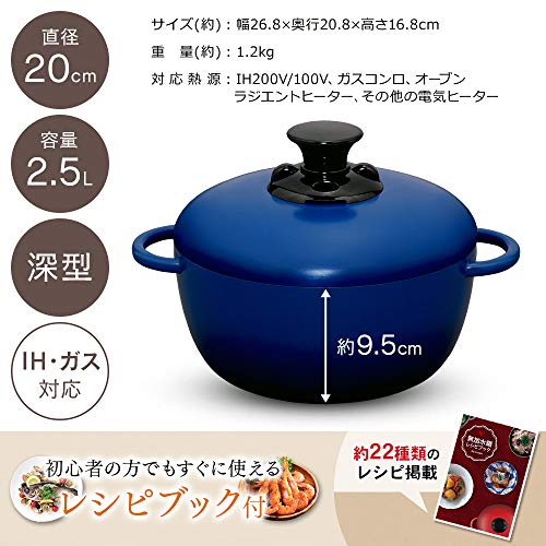 アイリスオーヤマ 両手鍋 無加水鍋 20cm ガス火/IH対応 深型 お手入れ簡単 時短・節約 レシピブック付き ブルー