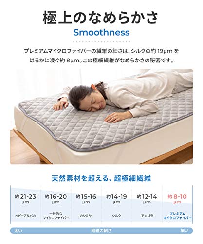 【特長1】:【mofua プレミアムマイクロファイバー敷パッド】が2020年装い新たにリニューアル。今年もモフモフの「気持ちよさ」をお届けします。はシルクより細い超極細繊維を使用することで、ずっとすりすりしていたくなるほど「しっとりなめらかな肌触り」と「あったかさ」を兼ね備えました。毛布とセットで使えばあったかサンド効果で朝までぬっくぬく。