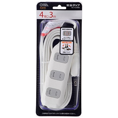 ホコリ防止シャッター付き 安全タップ 4個口 3m (HS-T1278W)