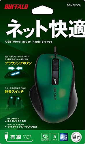 BUFFALO 有線 BlueLED 静音 5ボタンマウス グリーン BSMBU308GR
