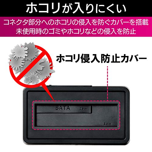 2.5/3.5インチどちらにも対応しておりますので、幅広くデバイスを選択することができます。差し込み口にホコリカバーが付いておりますので、未使用時にコネクタ部分に埃が侵入するのを防ぎます。