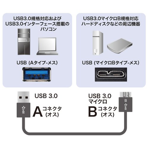 USB3.0ポートを持つパソコンと、ハードディスクなどのUSB3.0機器(マイクロUSB3.0)を接続するケーブルです。