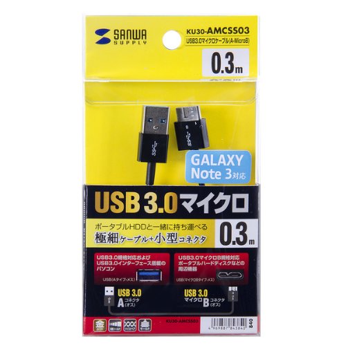 サンワサプライ USB3.0マイクロケーブル(A-MicroB) 超ごく細 0.3m ブラック KU30-AMCSS03