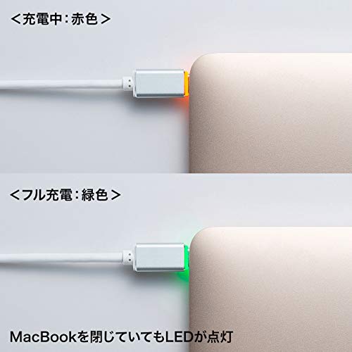 充電状況が分かるLED付きで、充電中はコネクタのLEDが赤色に点灯、充電終了近くになると緑色に点灯します。MacBookのふたを閉じていても充電中かどうかがわかります。
