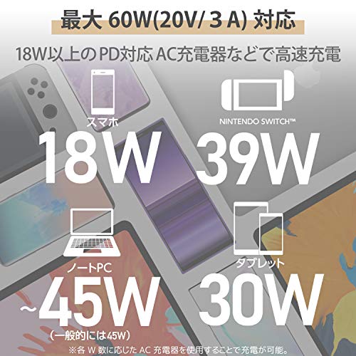 USB PD(PowerDelivery)に対応し、最大60W(20V/3A)の大電流を送電可能です。