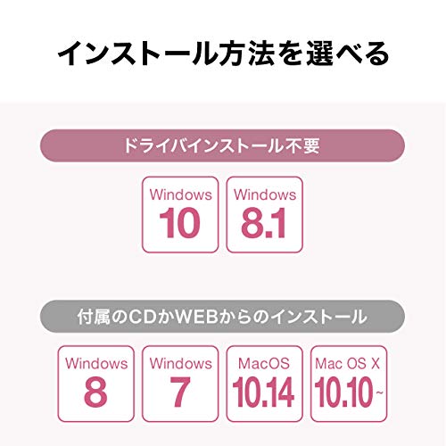 Windows 10・8.1ではドライバーのインストールが不要でUSBポートに挿すだけで使用することができます。その他Windows 8・7やmacOSシリーズは付属のCDまたは、WEBダウンロードによってドライバーをインストールすることにより使用することができます。