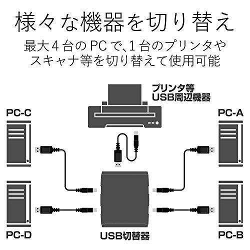4台のパソコンで1台のUSBプリンタやストレージ機器を切り替えて使用できる切替器