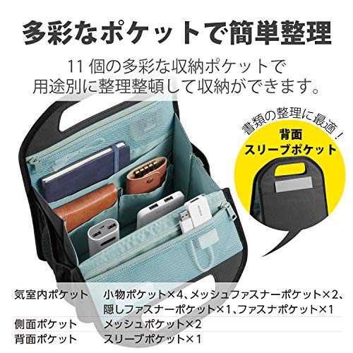 文房具やPC周辺機器を用途別に整理して収納できる、多彩なポケットを装備しています。