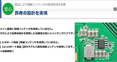 メイン基板に高分子アルミ固体電解コンデンサを使用しています。それにより長寿命設計を実現した信頼性の高いスイッチングハブです。