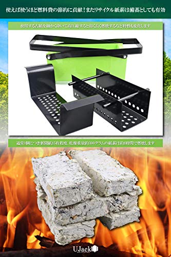 UJackのペーパーログメーカーでは新聞紙や要らなくなった古紙を使用して紙薪を作ることができます。作成した紙薪ブロックは焚き火や薪ストーブの補助燃料として活用できます。