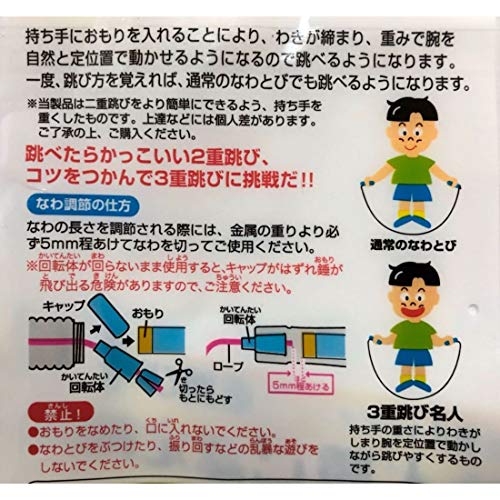 三重跳び専用に設計された、縄跳びロープです。 持ち手に重りを入れることにより脇が締まり、重みで腕を自然と定位置で動かせるようになるので早く跳べるようになります。