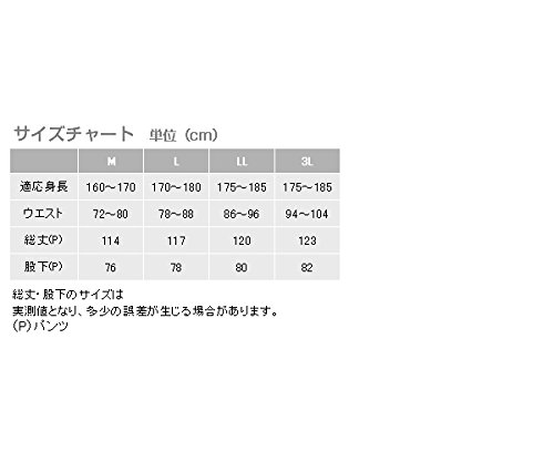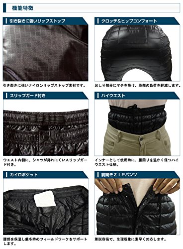 表地素材:ナイロン100%中綿素材:ダウン80%、フェザー20%適応サイズ(単位/cm):M(身長160~170、ウエスト72~80、総丈107、股下74)、L(身長170~180、ウエスト78~88、総丈109、股下75)、LL(身長175~185、ウエスト86~96、総丈111、股下76)、3L(身長175~185、ウエスト94~104、総丈113、股下77)