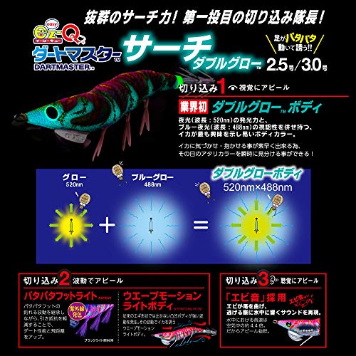 ダブルグローボディ:イカが最も興味を示し易い夜光(波長:520nm)の発光力とブルー夜光(波長:488nm)の視認性で、イカに気づかせ・抱かせる事が素早く出来る為、その日のアタリカラーを瞬時に見分ける事ができる!