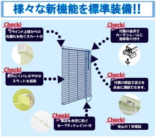 素材・材質:ヘッドボックス:アルミ押出し型材 スラット:耐食アルミ合金 ブラケット:ステンレス・樹脂 ボトムレール:アルミ押出し型材 チルトポール:ポリカーボネート 昇降コード:ポリエステル