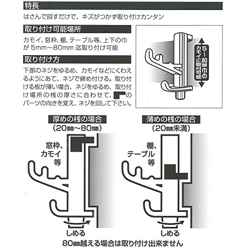 取付可能場所:カモイ、窓枠、棚、テーブル等、上下の巾が5mm~80mmまで。
