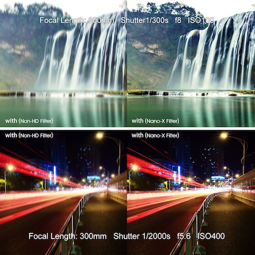 コーティング:世界最高レベルのMRCコーティング(マルチ・レジスタント・コーティング)技術使用、両面にそれぞれ7層のマルチコーティングとMRCコーティングが施されたNANO-Xシリーズフィルターは99.23%の透過率を実現。