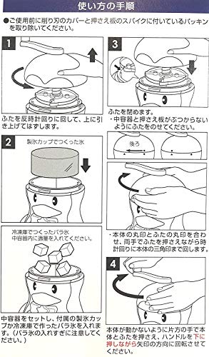 素材・材質:本体・ふた・ハンドル/ABS樹脂(耐熱温度70度・耐冷温度-20度)、つまみ/ポリプロピレン(耐熱温度100度・耐冷温度-20度)、中容器・製氷カップ/ポリエチレン(耐熱温度70度・耐冷温度-40度)、氷押さえ板/ポリアセタール(耐熱温度100度、耐冷温度-20度)、削り刃・バネ/ステンレス鋼