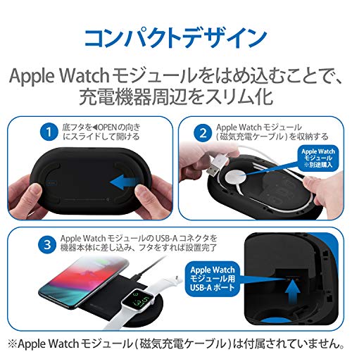 スマートフォンやAirpods等を置くだけで5Wで充電ができ、AppleWatch磁気充電ケーブルをはめ込むことでAppleWatchを同時に充電できる、Qi規格対応ワイヤレス充電器です。