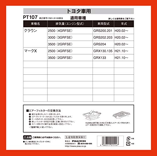 PIAA エアーフィルター 1個入 (トヨタ車用) クラウン・マークX_他 PT107