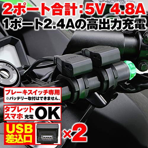 デイトナ バイク専用電源 USBx2 USB2口合計5V/4.8A (1口最大5V/2.4A) ブレーキスイッチ割り込ませタイプ メインキー