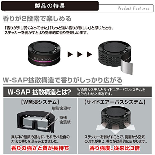 サイドエアーパスシステム:側面のステッカーを剥がすことで側面開口部から空気の流れが生まれることにより、香り強度が当社従来比3倍を実現W含浸システム:2種類の異なる含浸基材を組み合わせることにより、香りの強さと持続性を生み出す最適なバランスを実現