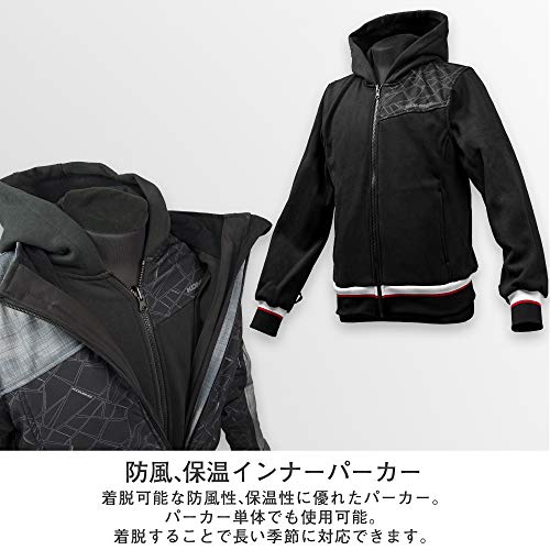 防風性と保温性に優れるソフトシェル素材のアウタージャケットに単体でも着用できるインナーパーカをジョイントした2in1ジャケット。