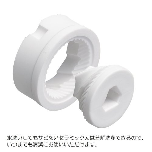 素材・材質:刃/セラミック磁器、本体/ABS樹脂(耐熱温度:100度)、容器/ガラス フタ/ポリプロピレン、つまみ/ポリアセタール、バネ/ステンレス鋼