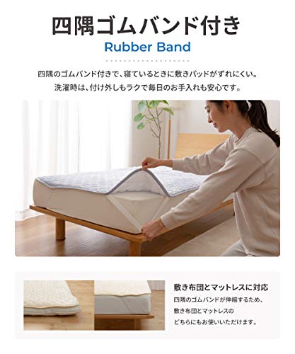 【特長2】敷きパッドの4隅にゴムバンドが付いているので、お洗濯の際の付け外しもしやすく、ずれにくい仕様。ベッドマットレスにも敷布団にもご利用いただけます。