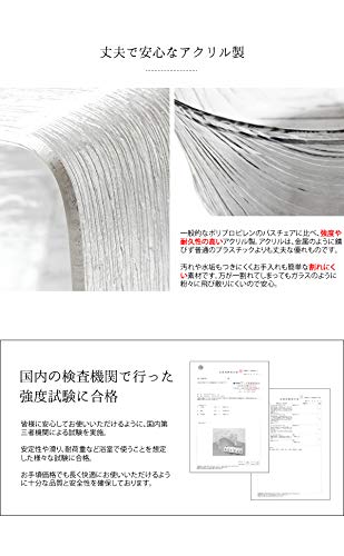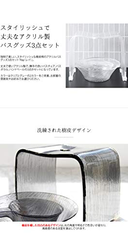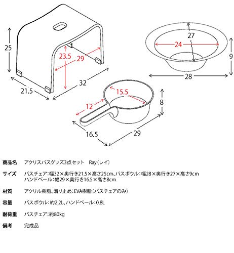 材質:アクリル樹脂、滑り止め:EVA樹脂(バスチェアのみ) 容量:バスボウル:約2.2L、ハンドペール:0.8L
