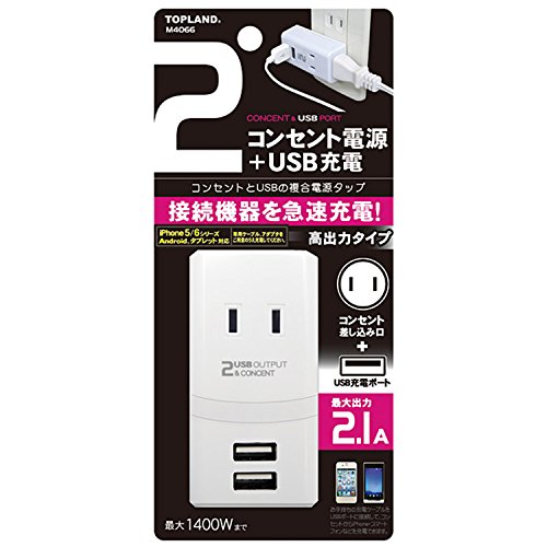 トップランド コンセントタップ&USB充電 2ポート 急速充電2.1A M4066
